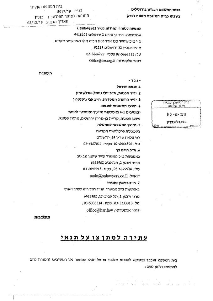 העמותה לטוהר המידות עתרה היום לבג"ץ בדרישה כי הכנסת תקים בהקדם וועדת כנסת לצרכי דיון בחסינות של חבר הכנסת כץ, ובבקשת חסינות של ראש הממשלה נתניהו, ככל שתוגש. כפי שנטען בעתירה, על הכנסת חלה חובה להקים וועדת כנסת שתדון בבקשות אלו, ולא ניתן להמשיך במצב שבו כתב האישום "מוקפא".